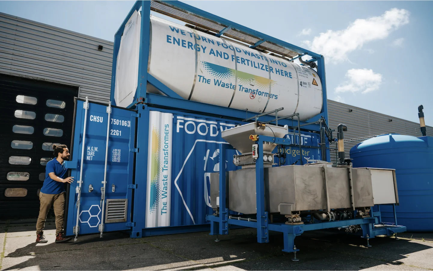 A Waste Transformer biodigester is an innovative modular system that processes your food waste into valuable resources like clean energy and bio-based fertilizers. Instead of sending your food waste to landfills, which means high disposal costs, Scope 3 emissions and risk to badly influence your reputation, our biodigesters process your food waste on your site, and preserve its value. This means lower waste management costs, reduced environmental impact, and compliance with stringent regulations. It simplifies your food waste handling, improves operational efficiency, and helps you meet sustainability goals set by your industry. By transforming your business food waste into valuable outputs, an on-site containerized biodigester will showcase your company’s reputation as a responsible leader in your industry, attract new customers and give your employees a positive feeling working for your brand.